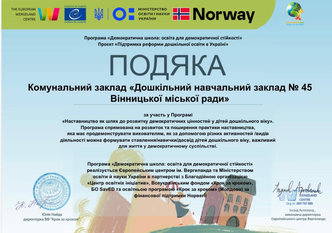 У 2025 -2026 навчальному році УЧАСТЬ У ПРОГРАМІ «Наставництво як шлях до розвитку демократичних цінностей у дітей дошкільного віку»